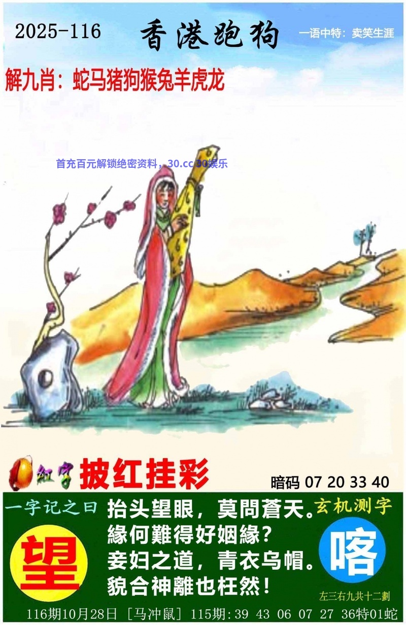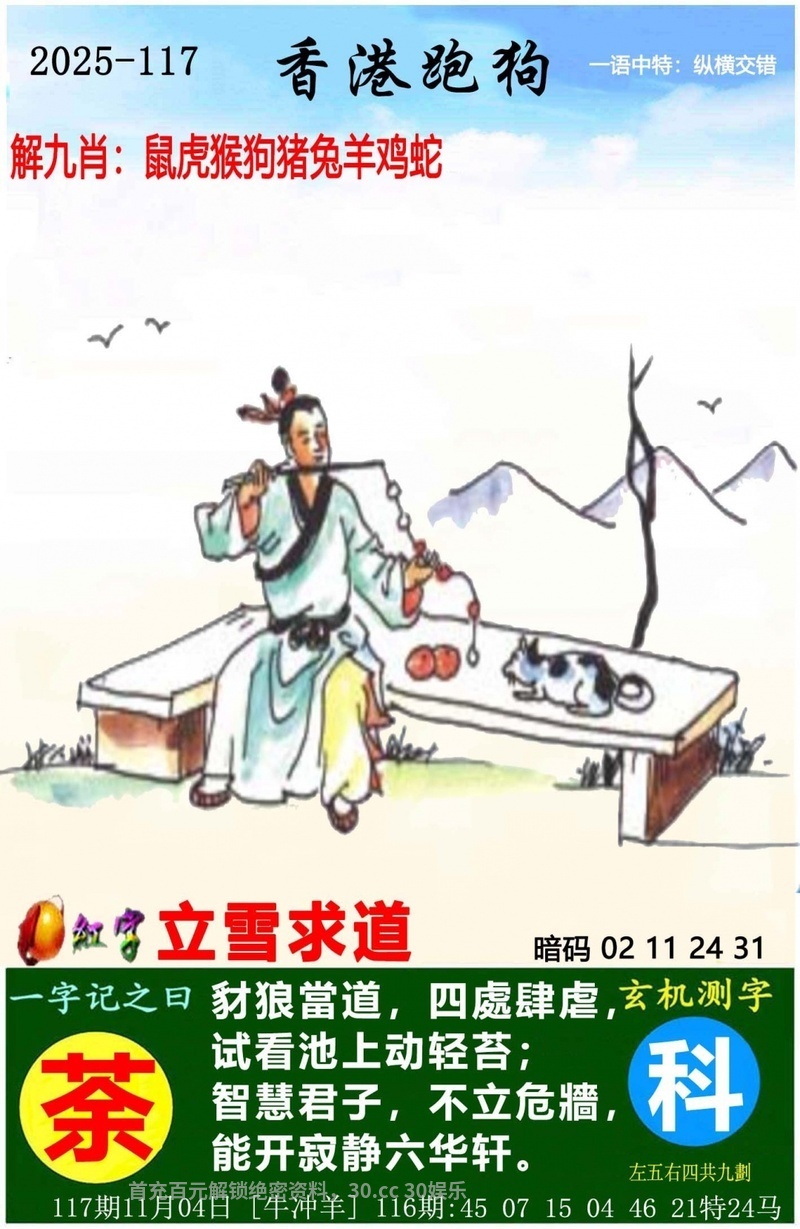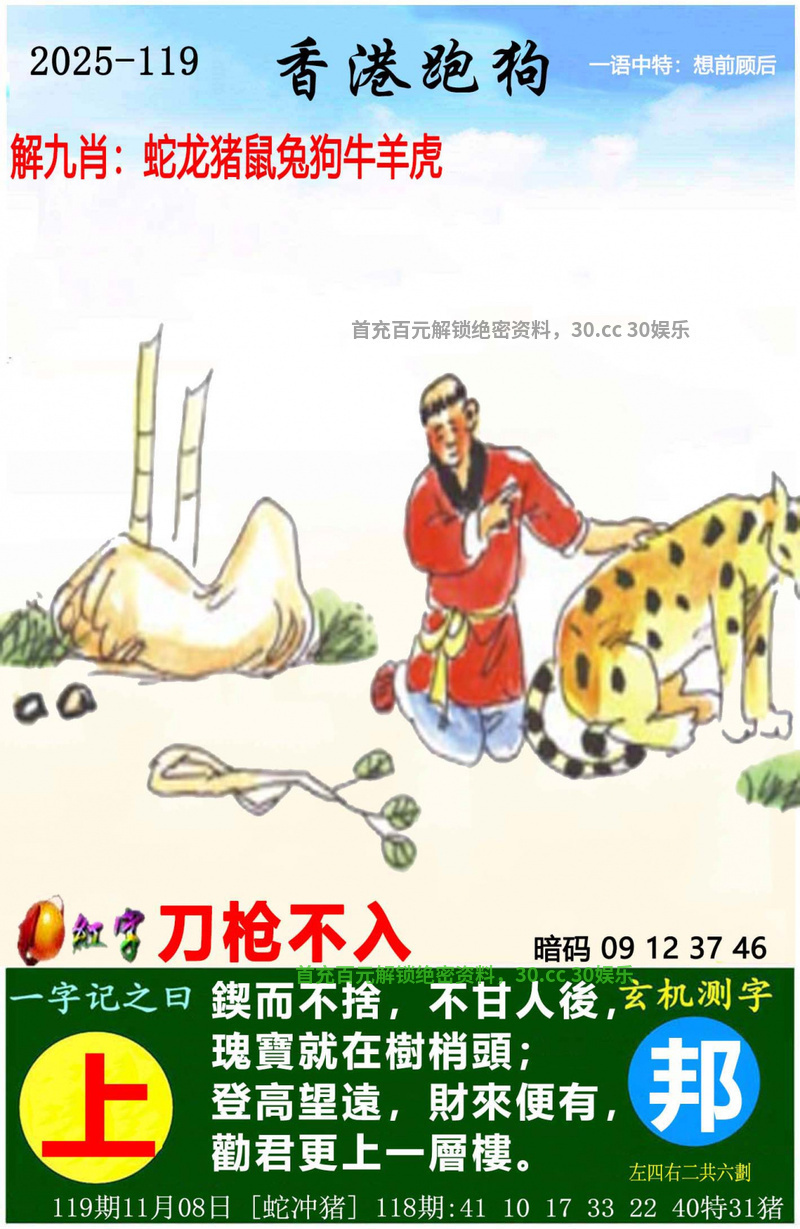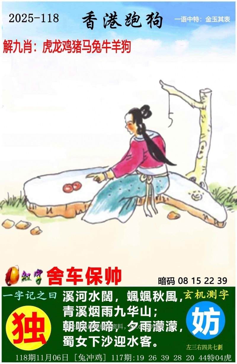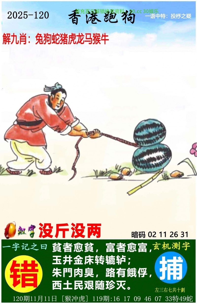新版跑狗诗 120期:新版跑狗一字記之曰【错】 朱門肉臭,路有餓俘, 西土民艰随珍灭。 玄機測字:《捕》 一語中特:投杼之疑 老版跑狗诗 120期老版跑狗一字記之曰:【看】 詩雲:月明中四人分朗,新丰树色绕千官 氣定神閒,安居巢中,八度陽光五瓜田。 以逸待勞,無需跟風,光焰长生明又朗。 玄機測字:《项》 另版跑狗诗 120期另版跑狗一字記之曰:【衝】 苦海無邊,回頭是岸。何必冒險去衡浪? 平安是福,窮也無妨。浮沉俗世任跌宕。 红字暗码 120期信箱红字:没斤没两 信箱暗码:02 11 26 31 |